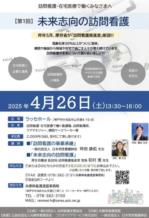 弊社高丸が代表を務める訪問看護支援協会が主催で、兵庫県看護連盟と共催で、2025年4月26日(土)にて、訪問看護や在宅医療向けのイベントを主催させていただきます。